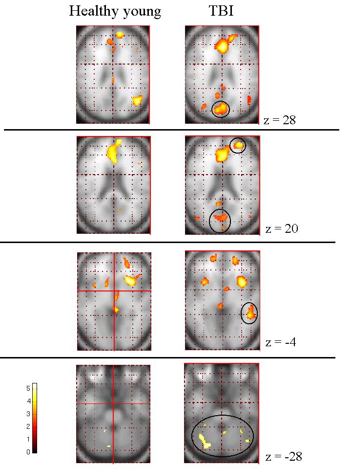 Patients who have made good recovery from significant traumatic brain injury (TBI) show areas of increased brain activity (circled) when performing memory tasks.